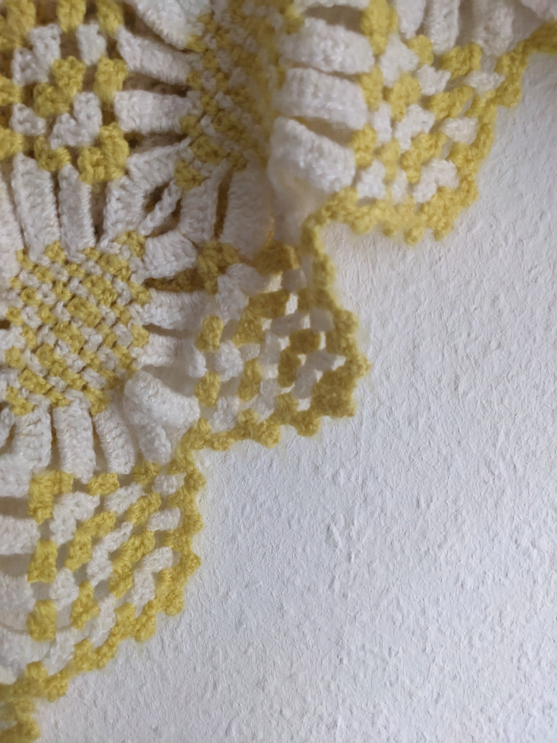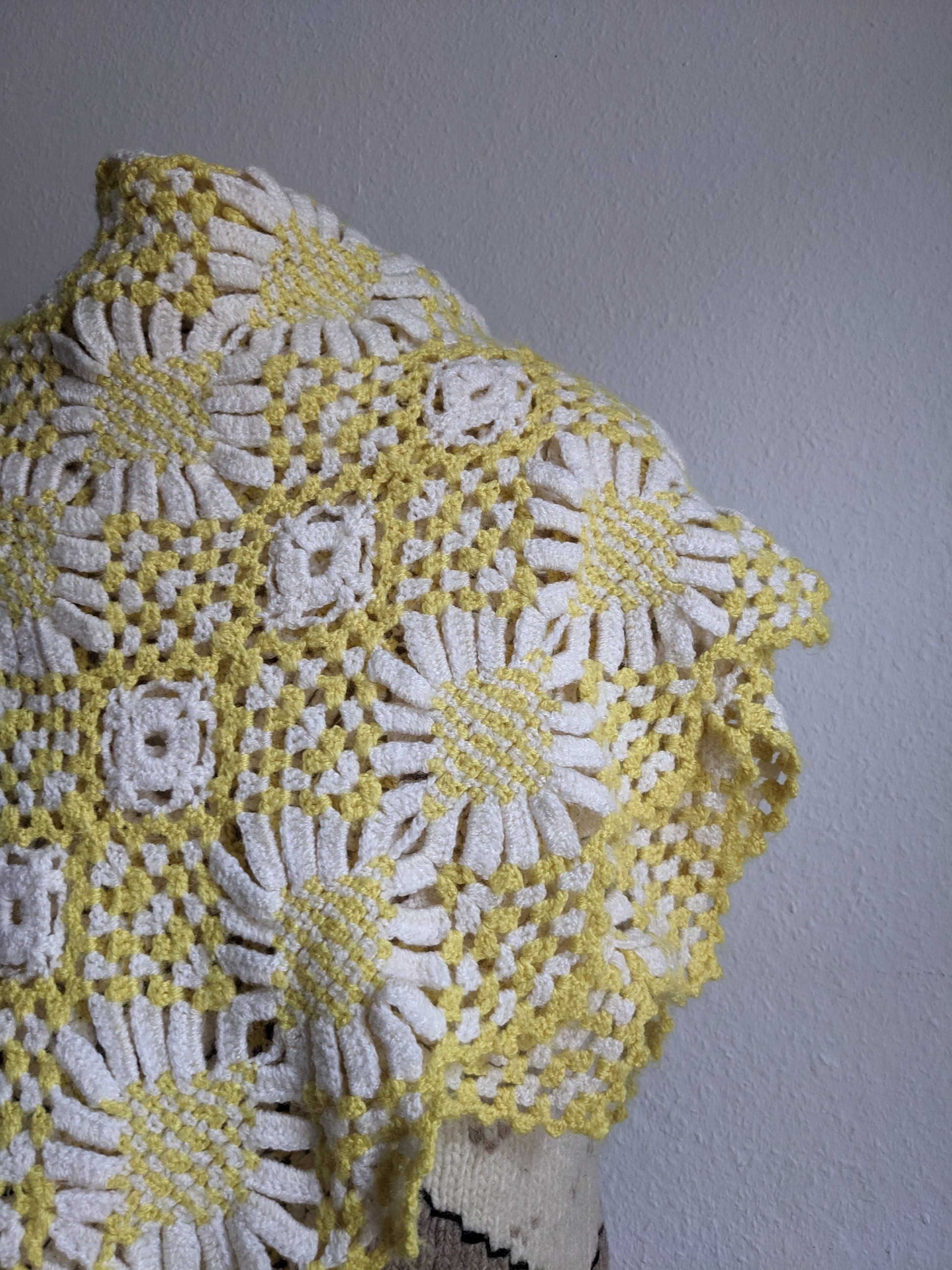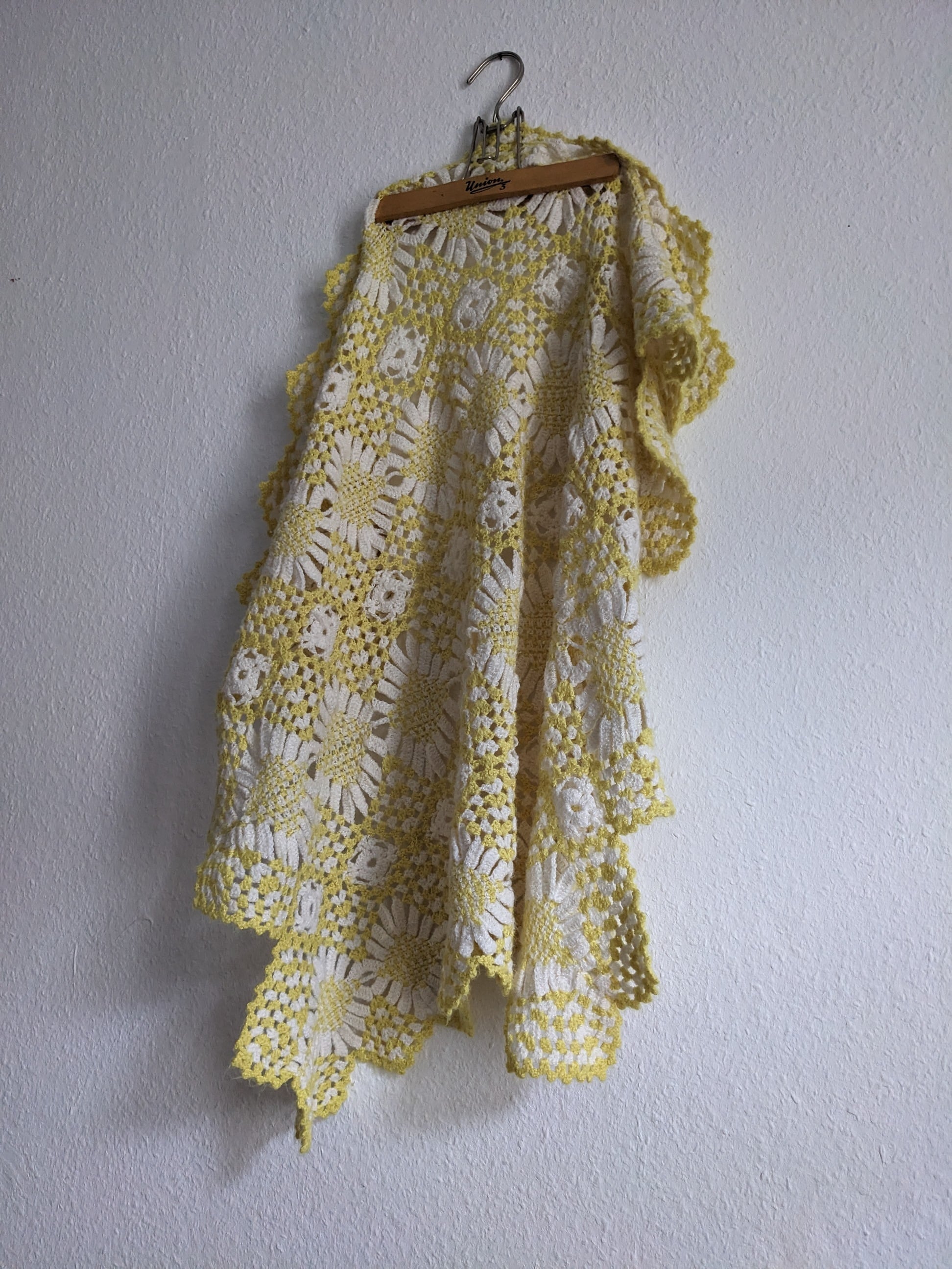 デイジーのようなモチーフが繋げられたレモンイエローのニットショールです