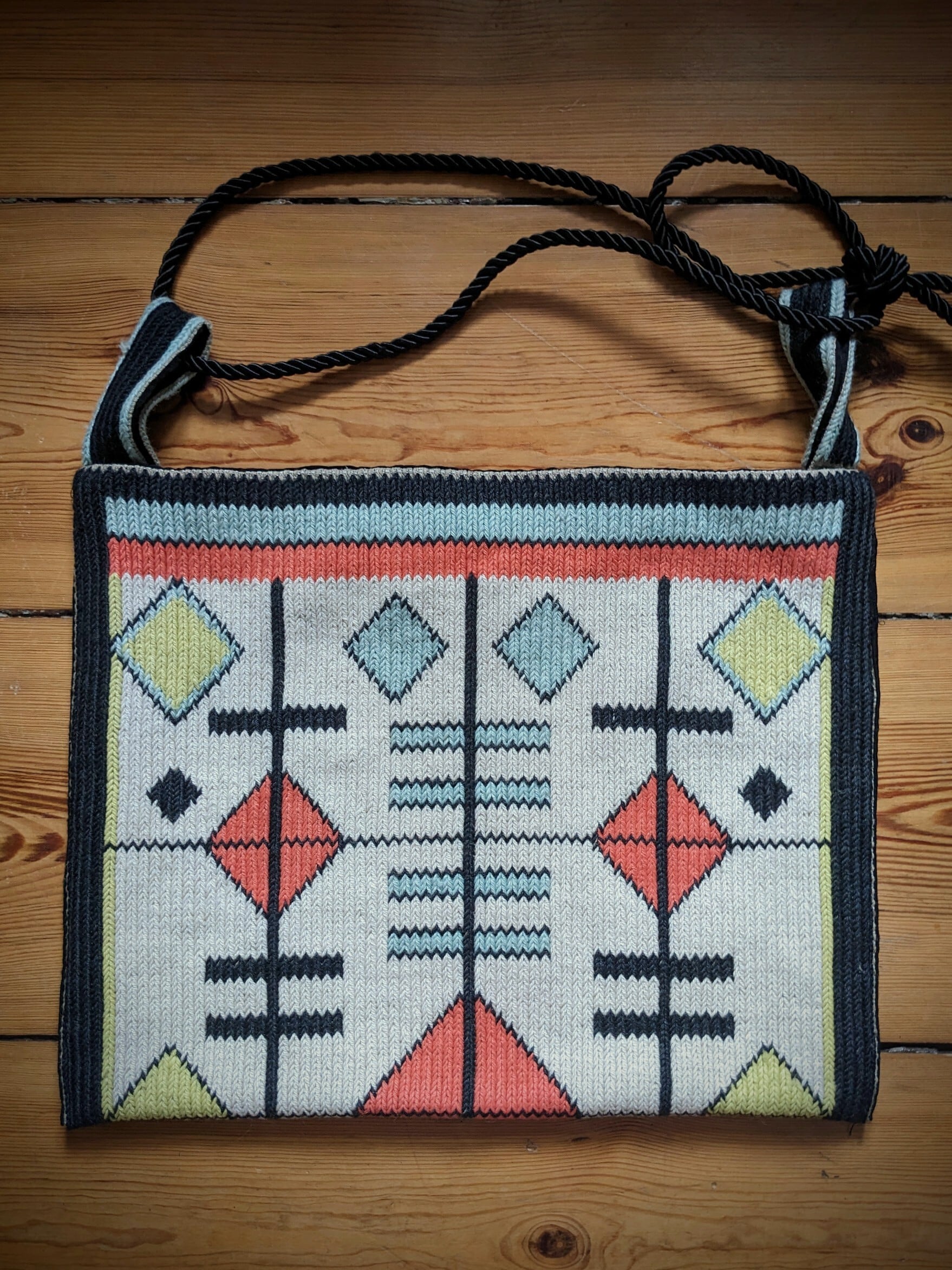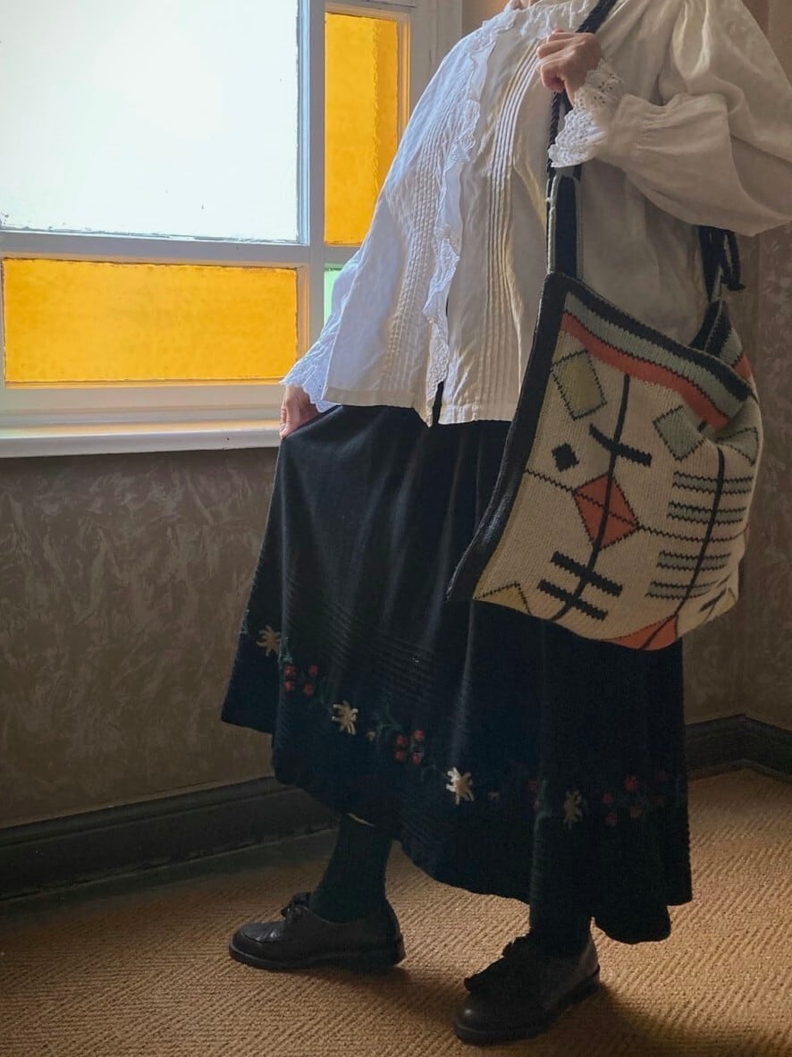 幾何学模様がかわいらしい、ヴィンテージのニット素材で作られたバッグです
