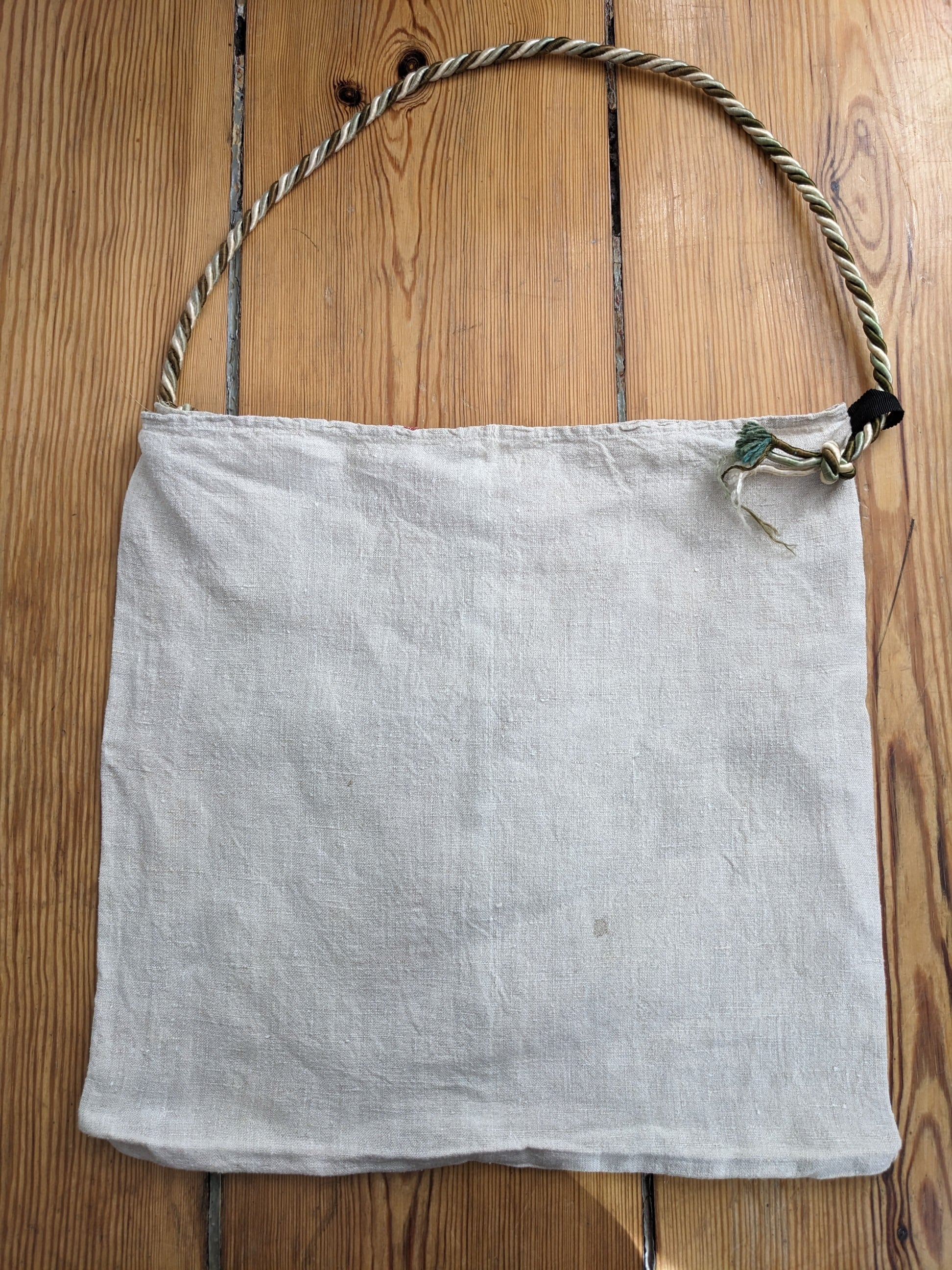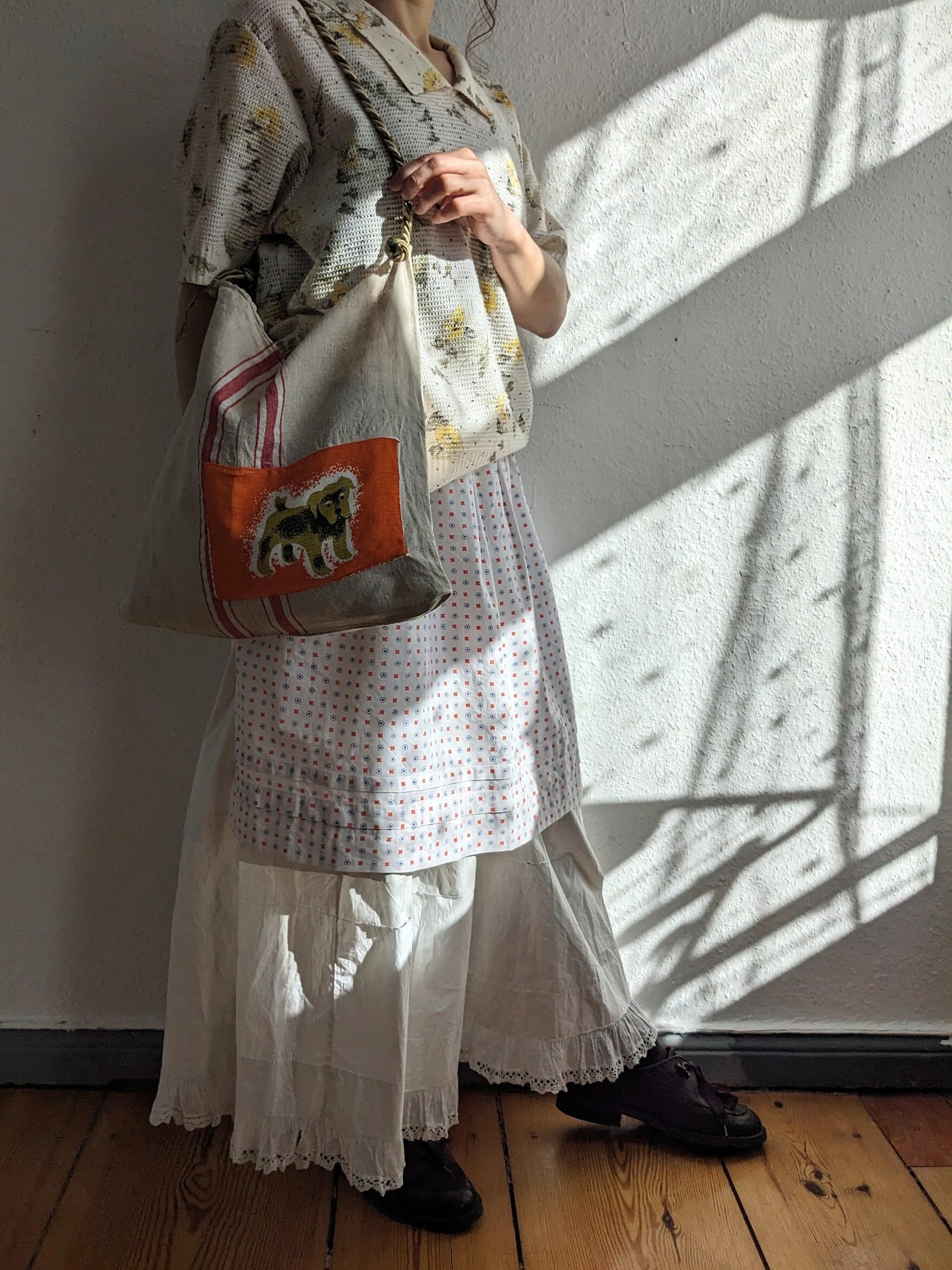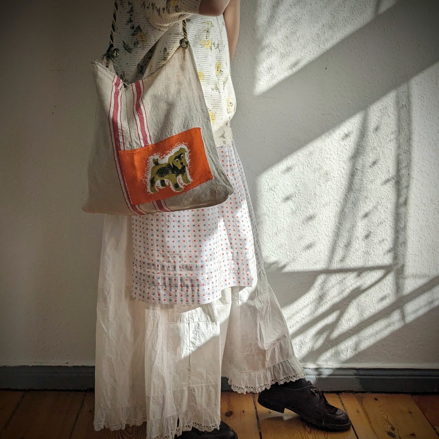 ドイツのヴィンテージベッドリネン布地を使用した、アップサイクルの肩掛けバッグです。